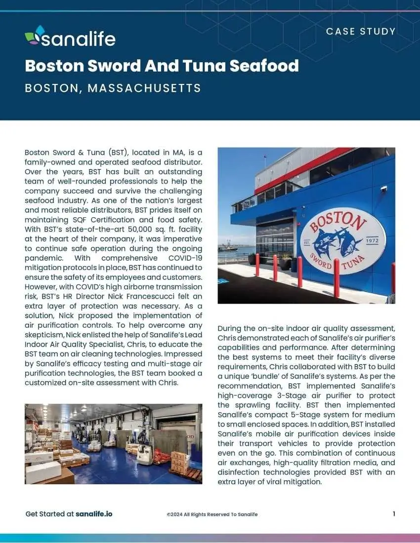 Boston Sword & Tuna (BST), located in MA, is a family-owned and operated seafood distributor. Over the years, BST has built an outstanding team of well-rounded professionals to help the company succeed and survive the challenging seafood industry. As one of the nation’s largest and most reliable distributors, BST prides itself on maintaining SQF Certification and food safety. With BST’s state-of-the-art 50,000 sq. ft. facility at the heart of their company, it was imperative to continue safe operations during the ongoing pandemic. With comprehensive COVID-19 mitigation protocols in place, BST has continued to ensure the safety of its employees and customers. However, with COVID’s high airborne transmission risk, BST’s HR Director Nick Francescucci felt an extra layer of protection was necessary. As a solution, Nick proposed the implementation of air purification controls. To help overcome any skepticism, Nick enlisted the help of Sanalife’s Lead Indoor Air Quality Specialist, Chris, to educate the BST team on air cleaning technologies. Impressed by Sanalife’s efficacy testing and multi-stage air purification technologies, the BST team booked a customized on-site assessment with Chris.